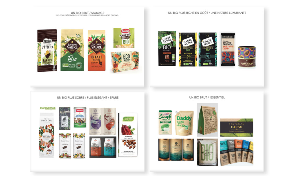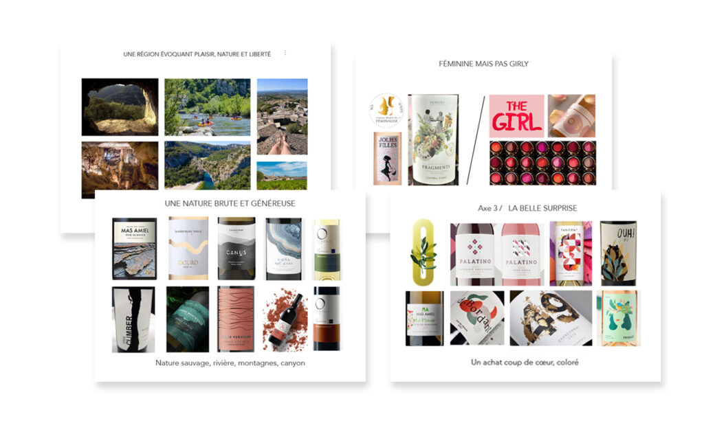 Notre culture des arts graphiques et du design packaging nous permet de définir les clés de lecture du benchmark. Croisé avec l’approche sociologique de Stéphane, nous décryptons les symboles et les codes de marchés.